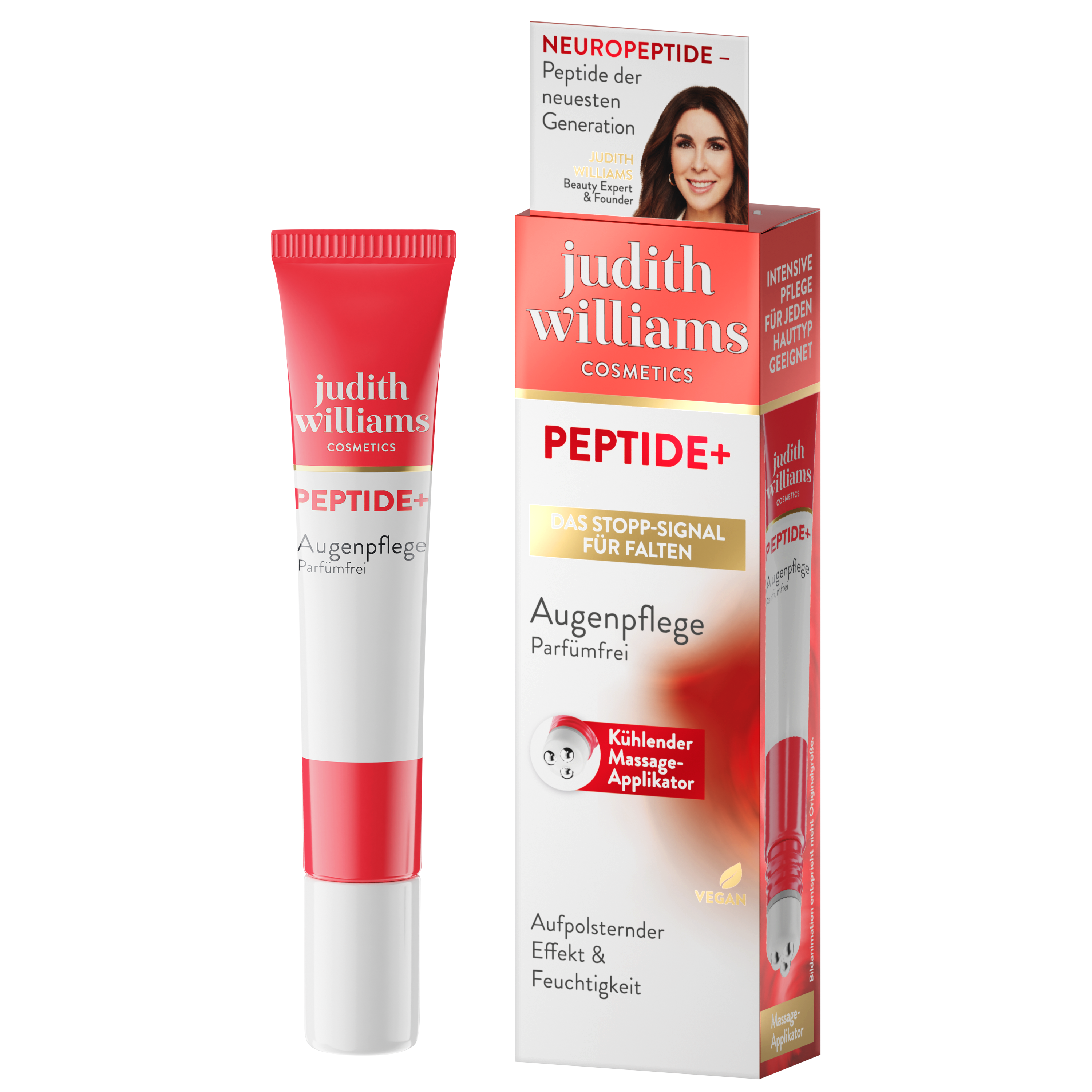 Die Peptide+ Augenpflege verjüngt die zarte Augenregion optisch. Die revolutionäre Formulierung mit Neuropeptiden zeigt eine zweifache Anti-Aging-Wirkung: Feine Linien und Krähenfüße werden optisch geglättet, während gleichzeitig der künftigen Faltenbildung vorgebeugt wird. Erfrischende Hyaluronsäure spendet intensive Feuchtigkeit und hat einen aufpolsternden Effekt. Mit dem kühlenden 3-Kugel-Massageapplikator werden die Ergebnisse maximiert, wobei das bewährte Antioxidans Vitamin E die sensible Augenpartie schützt.