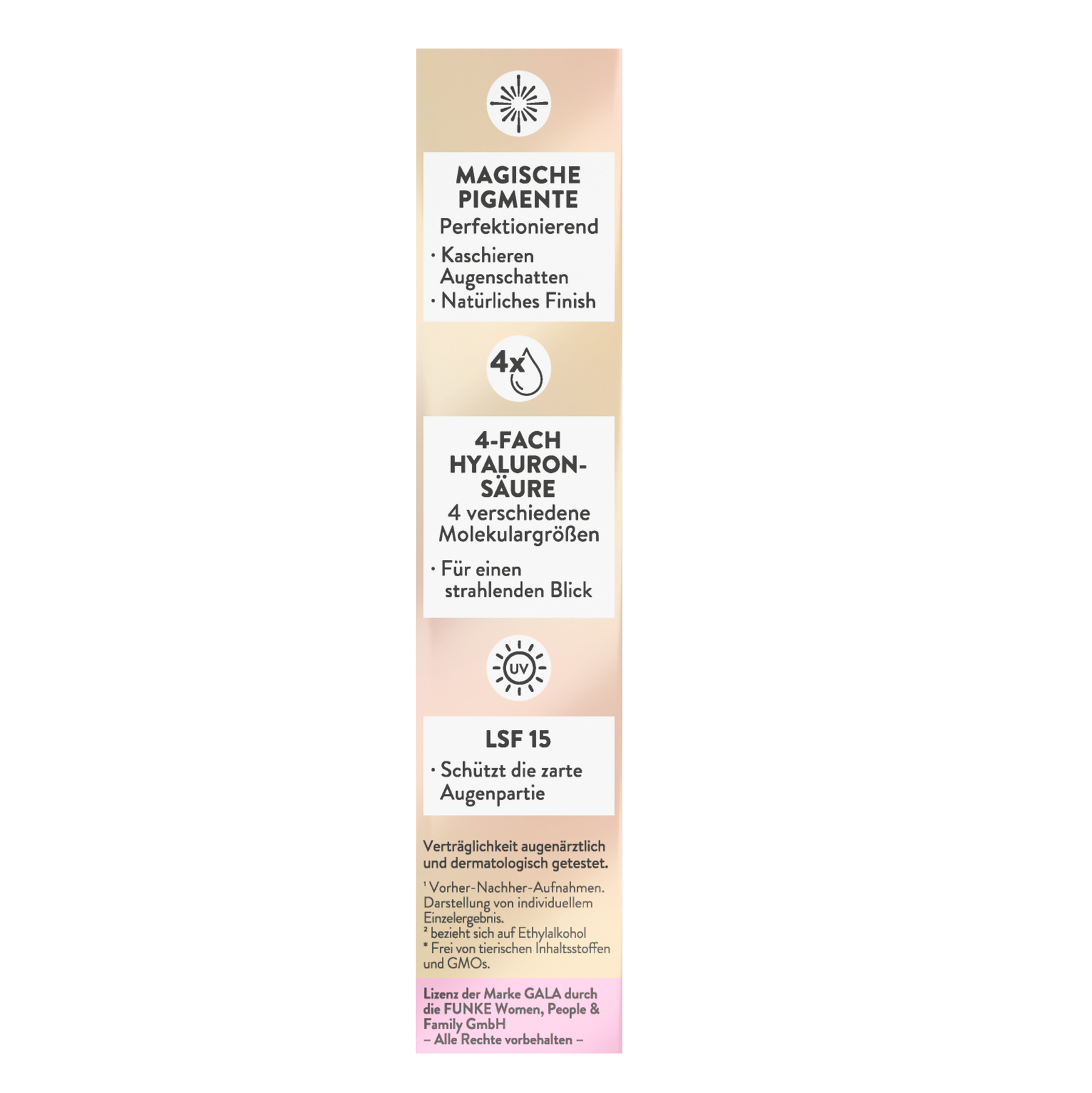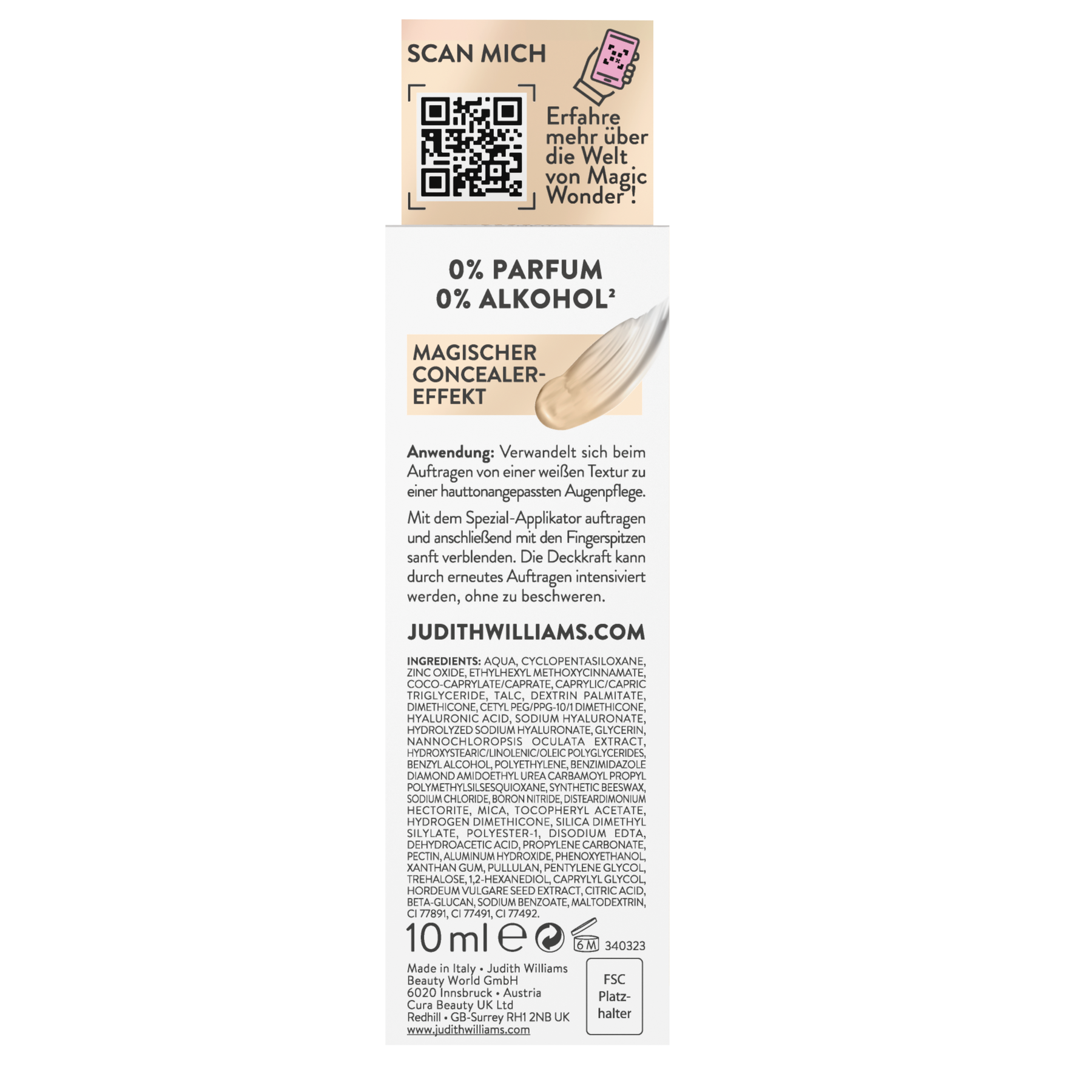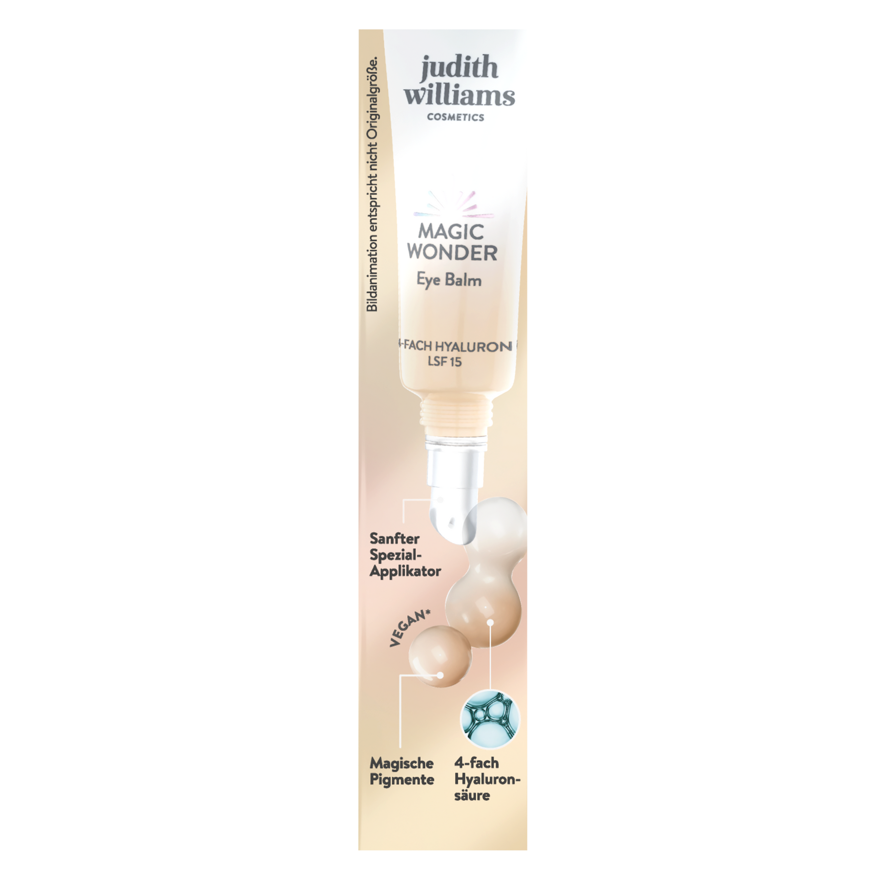 Müde Augen, kleine Schatten oder feine Linien? Der Magic Wonder Eye Balm spendet intensive Feuchtigkeit und sorgt dank Concealer-Effekt für sofortige Frische. Beim Auftragen verwandelt sich die weiße Textur mit magischen Pigmenten in eine hauttonangepasste BB Eye Cream, die Augenringe optisch kaschiert und das Hautbild harmonisiert. Die 4-fach Hyaluronsäure polstert Trockenheitsfältchen sichtbar auf, während LSF 15 die empfindliche Augenpartie vor sonnenbedingter Hautalterung schützt. Das Ergebnis: wache, ebenmäßige Augen mit natürlicher Leuchtkraft – in nur einem Schritt.